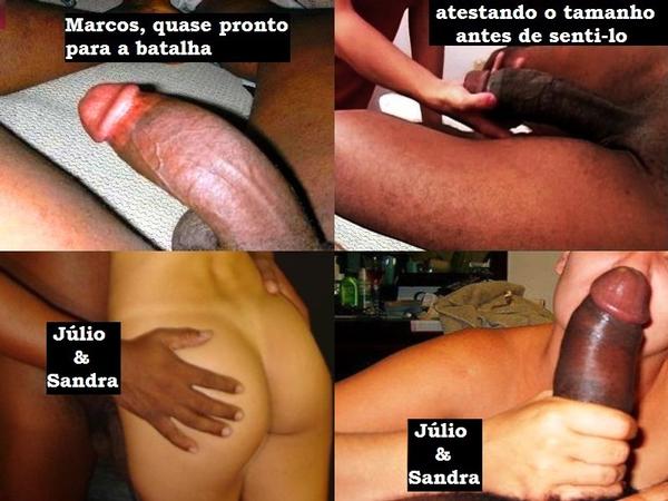 Já relatei aqui uma série de experiências frustrantes, em que fui corneado por minha ex-mulher, Carla, uma jovem ninfomaníaca de 26 anos, formada em Direito, aparência de menina adolescente, do tipo ninfeta, baixinha, morena (ou quase mulata), cabelos encaracolados, apenas simpática de rosto, mas com um corpo perfeito, seios pequenos e duros e uma bunda muito grande, rígida e empinada. Eu me chamo Carlos (fictício), sou advogado, tenho 36 anos, 1m e 70 de altura, boa aparência, mas não tenho um físico atlético. Nos separamos depois de 5 anos de convivência, mas continuamos a nos ver por algum tempo, até que afastei-me definitivamente depois do último dia dos namorados (2010), quando a flagrei transando com Júlio, que é afilhado dos meus pais, e com o irmão dele, Marquinho (relato “corno de Carla nunca mais”), com quem ela namora até hoje. Desde então, nunca mais nos vimos. Ela ainda me manda e-mails quase diariamente, alguns com relatos de suas experiências sexuais, outros com fotos dela vestindo roupas provocantes, e também de seus amantes em cenas de sexo, às vezes me pede para voltar para ela, dizendo que me ama, que eu sou o homem da vida dela. Eu nunca respondi nenhuma de suas mensagens, embora já tenha me masturbado várias vezes apreciando suas fotos. Há 2 meses, conheci Sandra, uma advogada de 29 anos, bonita, morena clara, baixinha, corpinho mignon. Conversamos nos corredores do fórum e começamos a namorar rapidamente. Só não sabia que ela era advogada no mesmo escritório onde Carla é estagiária, e que ela se interessara por mim justamente por causa das coisas que Carla falava a meu respeito. Isso só fiquei sabendo algumas semanas depois. Carla passou, então, a me mandar mensagens por e-mail, alertando-me para não confiar demais em Sandra. Lá pela segunda ou terceira mensagem, eu não resisti e mandei-lhe uma resposta bastante grosseira. Disse-lhe que não tinha motivos para desconfiar de minha namorada, e que nem toda mulher era uma puta sem caráter como ela. Por fim, mandei-lhe parar de me enviar mensagens, pois já havia esquecido que ela existe e ela devia fazer o mesmo. Duas semanas depois, Carla me mandava um e-mail que dizia exatamente o seguinte: “vc confia em sua namoradinha? então v as fotos”. Abri os anexos e levei susto. Lá estavam Sandra, Carla, Marquinho e Júlio, em cenas de sexo. Como já disse, Júlio é afilhado de meus pais, com 36 anos, um negro alto, forte e muito bem dotado (segundo os e-mails de Carla, 23,5 cm). Marquinho é irmão de Júlio e atual namorado de Carla, um pouco mais magro, um pouco mais alto e ainda mais dotado (ela afirma que costuma ter entre 25 e 26cm, dependendo do tesão). As fotos daquela suruba me transtornaram instantaneamente. Eu sequer estava apaixonado por Sandra, mas aquilo trazia à tona todas as humilhações que eu já tinha passado com minha ex-mulher. Apesar da hora (era quase meia noite), não agüentei e liguei para Carla, exigindo explicações. Assim que ela atendeu, percebeu o meu desespero e ironicamente, quase rindo, me interrompeu: “Já sei. Você viu meu e-mail”. Eu não me lembro bem o que eu disse, mas me lembro o que ela me respondeu: “Não te disse para não confiar nela? Se eu não fotografasse, você não ia acreditar em mim. Ela adorou o pau do meu namorado, sabia? Mas não fica chateado não, Corninho. Você já devia estar acostumado”. Naquele momento, se ela estivesse ao alcance das minhas mãos eu a teria surrado, mas pelo telefone só podia tentar entender o que havia acontecido. Ela, com toda a paciência e sadismo possível, me narrou toda a história, e eu, agora, lhes dou um resumo. Carla já havia percebido o interesse de Sandra em ouvir suas confissões sexuais, e, principalmente, quando falava sobre o tamanho do dote de Marquinhos. Bastou, portanto, encontrar a oportunidade certa. E essa oportunidade ocorreu no sábado (12/09), quando combinaram de irem juntas a praia. Sandra me avisou que iria a praia com uma amiga, mas não me disse com quem, talvez por saber que eu não concordaria. Eu havia levado muito trabalho para fazer em casa e não pude ir com ela. Então foram as duas sozinhas, no carro de Sandra. Entretanto, como Carla tinha planejado, Marcos ligou mais tarde para o celular dela, informando que também havia decidido ir a praia, e a encontraria por lá. Depois de algum tempo ele apareceu e foi apresentado a Sandra. Quando ele se afastou para dar um mergulho, Carla perguntou: – Então,o que achou do meu namorado? – Simpático... alto... muito alto – respondeu minha namorada,meio sem jeito. – Viu o volume na sunga? Não é enorme? – Que isso?! Claro que não olhei. – Então olha quando ele estiver voltando. Quando Marcos retornou, as duas se entreolharam e sorriram. Carla afirma que ele tem um volume indisfarçável na sunga de banho. Eu nunca vi. Ela, então, sussurrou no ouvido de Sandra que iria provocá-lo um pouco para ver se ficava duro. Sandra fez uma expressão de desaprovação, mas, em seguida, sorriu. Levantou-se e foi para a água. Enquanto isso, Carla começou a beijá-lo e passar, discretamente, a mão sobre a sunga do namorado, que estava deitado sobre uma canga (já que tinha ido de ônibus, e não tinha levado cadeira). O pau ficou duro rapidamente. Carla pediu-lhe para que não disfarçasse o volume, pois queria que Sandra o visse naquele estado. Marcos,como é muito safado, concordou. Ficou deitado, fingindo que cochilava. Assim que ela voltou do mar, arregalou os olhos e sorriu para Carla. – Meu Deus! Como é que você agüenta isso tudo? – sussurrou Sandra, sorrindo. – Com jeitinho dá, minha amiga. Com jeitinho... Quer experimentar? Eu empresto – disse Carla em tom de brincadeira. – Você é muito louca! Lá pelas 3h da tarde, eles resolveram ir embora. Marcos disse que voltaria de ônibus, mas Sandra fez questão de levá-lo de carona, pois também levaria a amiga. Chegando a casa de Carl