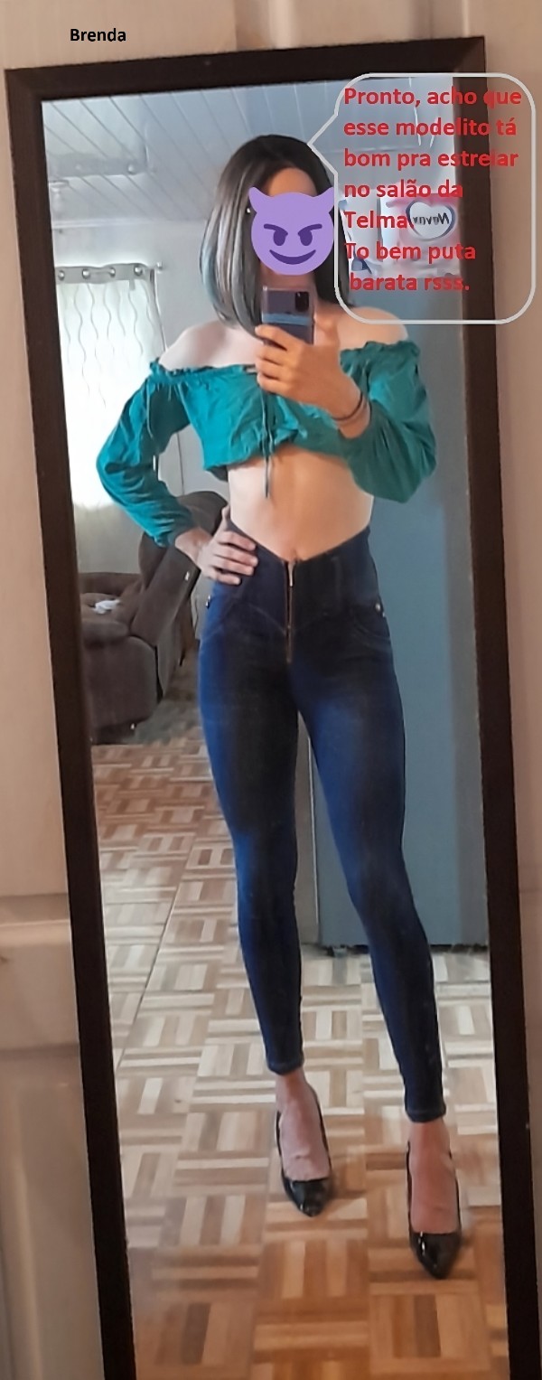 Chegando então o dia , Rebeca levou Allan, (que já estava de Brenda) no carro até próximo ao salão de Telma, e Allan foi até o salão andando na rua como se fosse uma mulher mesmo de salto ,calça jeans elastano super apertada , uma calcinha preta fio dental, uma blusinha , peruca , maquiagens ,unhas postiças e uma bolsinha rosa em formato de coração. Allan estava pegando pesado nos exercícios de academia, na dieta e estava magrinho , mas com um bundão empinado de dar inveja , e pernas bem torneadas pois desde que tinha virado a Brenda só fazia exercícios em casa com o novo equipamento que havia comprado só para isso, e estava com um corpinho mignon que muitas mulheres sonhavam em ter, pois era difícil achar uma mulher com o corpo parecido ao seu onde quer que ele saísse montado. Débora não foi nesse dia pois Rebeca levaria Allan para mamar os coroas e depois ela o buscaria de volta e para isso iria ficar no mesmo quarto de hotel onde Allan ficava hospedado em Chapecó.