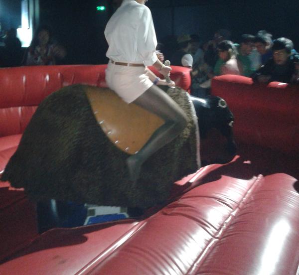 Então ela já depois de ter chamado a atenção de metade das pessoas na festa, disse que queria experimentar o touro mecânico.
